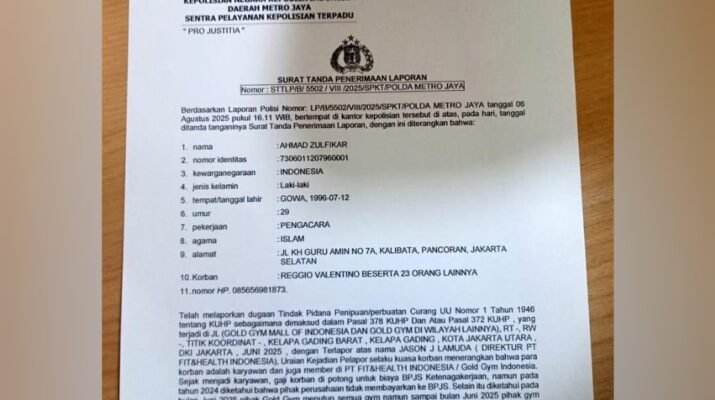 Adapun, pelaporan tersebut telah terregistrasi dengan nomor LP/A/5502/11/2025/SPKT/POLDA METRO JAYA, tertanggal 6 Agustus 2025.